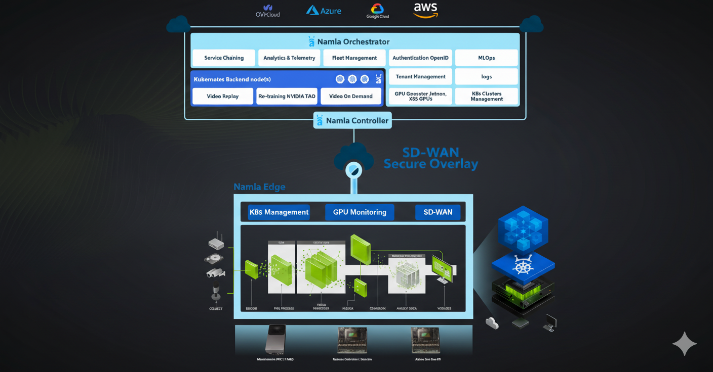 As an official NVIDIA Metropolis partner, Namla brings cloud‑native orchestration and edge management to the ecosystem. This enables Metropolis microservices to run securely and at scale on a Kubernetes‑native infrastructure, seamlessly connected from the cloud to the edge through the SD‑WAN network.
